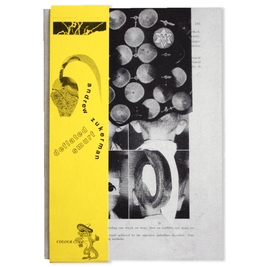 Deflated Smurf is a reproduction of a one-off collage exercise-book kept by the artist in the first part of 2017. The original was a defaced copy of a book for adolescents about how bridges are constructed. Zukerman limited his pallet to black & white, and sometimes blue (the titular Smurf). The book is reproduced here in an abridged 24-page edition, faithfully riso printed in black, with blue replaced by a dashing gold spot colour.